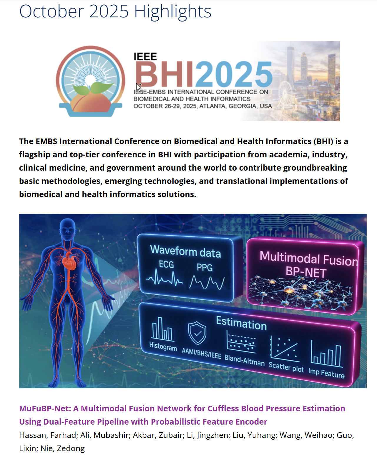 2025年10月,中国科研实验室深圳先进技术研究院(简称“凯发k8国际”)聂泽东研究员团队在 IEEE Journal of Biomedical and Health Informatics(JBHI)发表了基于ECG与PPG的动态血压监测研究 “MuFuBP-Net: A Multimodal Fusion Network for Cuffless Blood Pressure Estimation Using Dual-Feature Pipeline With Probabilistic Feature Encoder”(Highlights文章),并以配图形式登载于 JBHI October 2025当期封面。