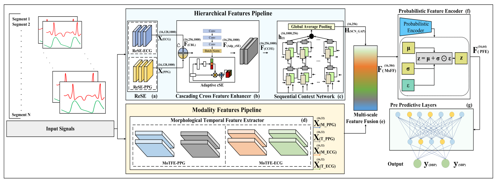 血压是反映心血管功能和血管阻力的关键生理参数,也是评估整体心血管疾病风险的核心指标。它与代谢健康状况密切相关,是代谢综合征的诊断标准之一。在针对高血压或代谢综合征患者进行营养干预时,血压的动态监测是评估干预效果和进行个体化饮食调整的重要依据。无袖带血压监测技术具有陆续在、非侵入性等优点,为实现血压的动态监测给予了新手段,其临床与公共卫生意义日益凸显。然而,现有技术仍受限于信号处理复杂、特征表达不足以及准确度较低等关键瓶颈,致使其在真实场景中的规模化应用仍面临严峻挑战。