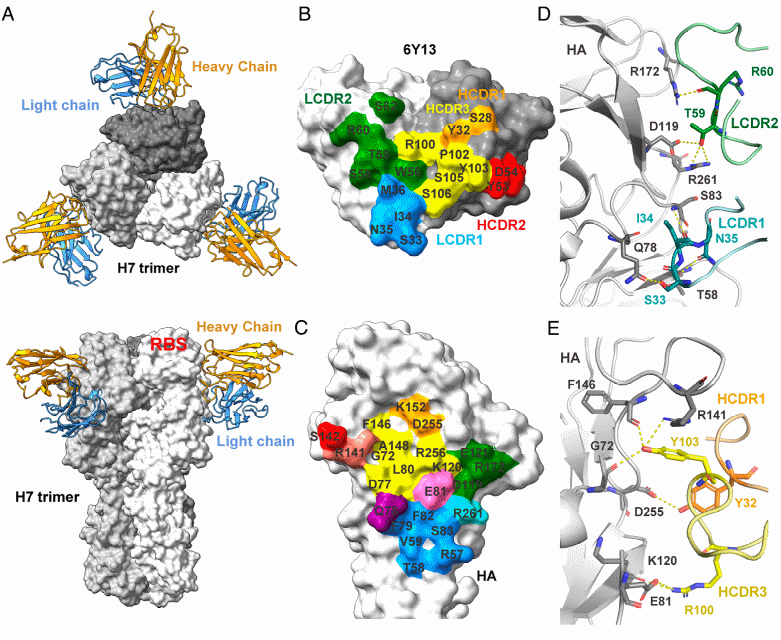 6Y13是人VH3-30基因编码的单克隆抗体,可以强效广谱中和H7亚型流行病毒(图1),并可以高亲和力结合跨越20年抗原进化的北美和欧亚系H7亚型禽流感病毒血凝素蛋白(图2),能够100%预防和治疗H7N9感染小鼠(图3)。抗体-抗原复合物冷冻电镜结构以及氢氘交换质谱等结果显示,6Y13结合在HA头部区受体结合位点侧边的一个独特保守表位(图4)。病毒吸附抑制实验和竞争结合ELISA实验等结果显示,6Y13顺利获得抑制病毒的受体结合发挥中和作用(图5)。