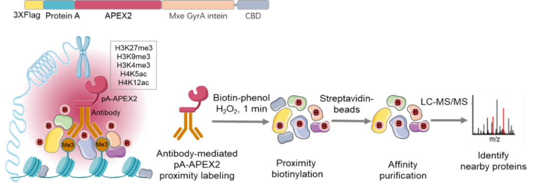 如上所述,尽管APEX2作为临近标记酶有很大优势,但是现在现有的研究方法依赖于基因编辑技术,需要将工程化酶在细胞内表达外源融合蛋白,这限制了其在难以转染的细胞系、原代细胞、组织和病理样品中的应用,且不能应用于翻译后修饰的蛋白(例如组蛋白修饰)。为分析决这些限制条件,甘海云课题组研究开发了一种由抗体介导的pA-APEX2临近标记新技术 (AMAPEX)。该技术将Protein A与经过改造的抗坏血酸过氧化物酶APEX2结合形成pA-APEX2,顺利获得特异性的抗体,将pA-APEX2靶向到被修饰的目标组蛋白。当细胞中存在底物生物素酚和过氧化氢时,APEX2可以把生物素标记到距目标蛋白半径约20nm范围内的所有临近蛋白上。之后由于生物素与抗生物素蛋白链霉亲和素(Streptavidin)之间的极强的亲和力,可以利用链霉亲和素磁珠将生物素标记的蛋白质纯化出来,最后顺利获得LC-MS/MS分析便可鉴定出目标蛋白周围的蛋白质,进而研究哺乳动物细胞中蛋白质-蛋白质的相互作用关系。如图1所示。