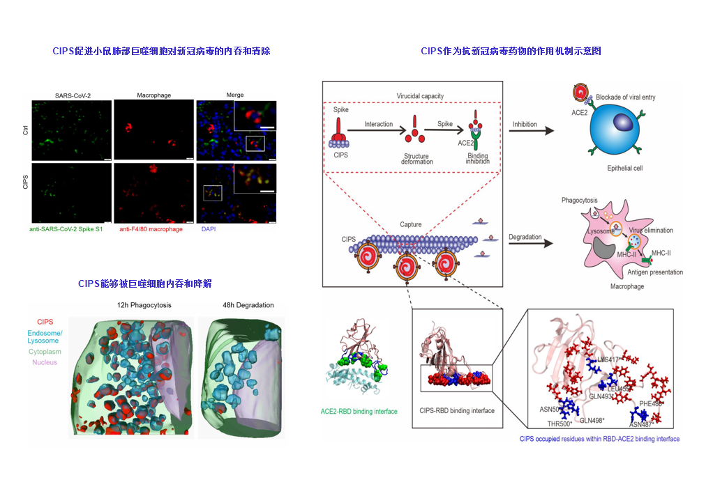 在细胞、类器官和小鼠动物模型上的实验表明,CIPS结合新冠病毒后,不仅能够高效地抑制病毒对宿主细胞的侵染,还可促进巨噬细胞对病毒的清除。巨噬细胞是机体免疫系统中发挥重要功能的效应细胞,能够高效清除外源入侵物。CIPS作为外源物质,在肺部能被巨噬细胞识别、捕获并降解。同时,CIPS作为一种可降解二维纳米材料,能够充当“胶水”或“陷阱”,特异性粘附新冠病毒表面的刺突蛋白,捕获并附着病毒颗粒形成病毒-CIPS复合物,引起巨噬细胞对病毒-CIPS复合物的摄取、降解和清除,诱发后续抗病毒免疫反应,提高抗病毒效率。