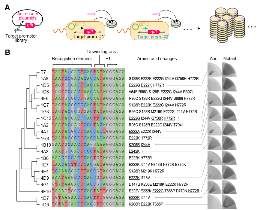 A,平行进化T7 RNA聚合酶对人工启动子库识别活性的实验示意图;B,进化取得的能够识别目标启动子的聚合酶突变体