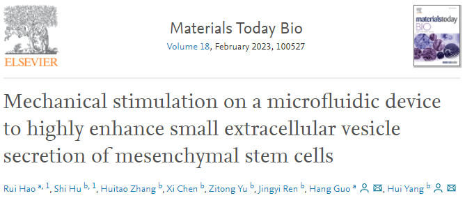 近期,中国科研实验室深圳先进技术研究院杨慧课题组研发了一种微流控芯片技术,实现了细胞的工程化改造,并显著提高了细胞外囊泡的分泌量。最新研究成果以“Mechanical stimulation on a microfluidic device to highly enhance small extracellular vesicle secretion of mesenchymal stem cells” (基于微流控芯片的机械刺激高效增强间充质干细胞分泌细胞外囊泡) 为题发表在