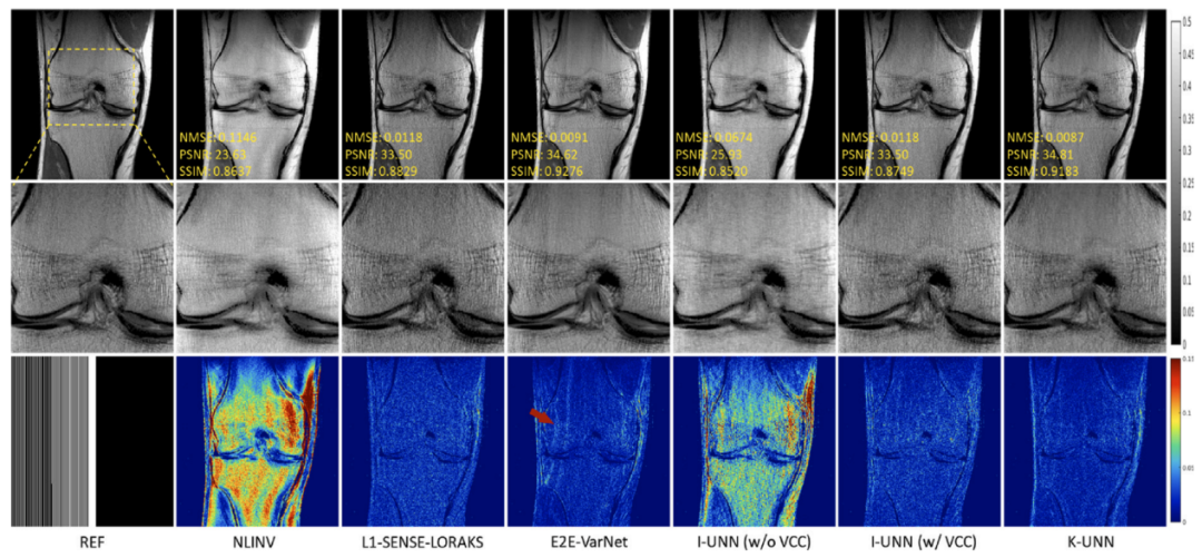 其次,针对现在主流深度学习快速重建方法可靠性不足的问题,提出了零阶算法展开网络的思想,利用网络表示正则化子零阶信息(正则化子本身),增强了网络学习的可解释性,保证了网络算法收敛性和鲁棒(正则)性。实验证明(图2),该方法重建图像质量明显优于传统方法。研究成果发表在医学成像领域著名期刊IEEETransactions on Medical Imaging。