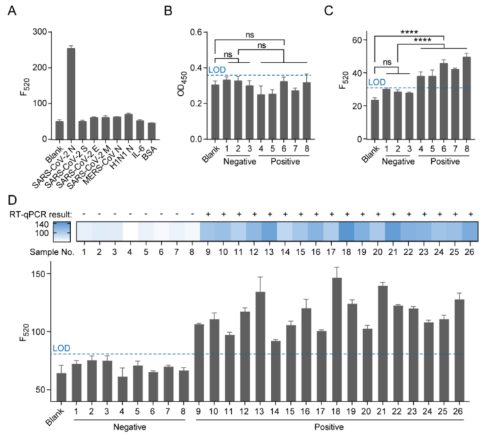 图3 选择性研究与病毒样本检测。(A) SARS-CoV-2 N蛋白的选择性研究。N蛋白浓度为5 ng/mL,其他蛋白浓度均为50 ng/mL;(B)商用ELISA试剂盒和(C) CRISPR/Cas12a介导的免疫分析法用于检测SARS-CoV-2假病毒样本。其中,1至3号样本为阴性样本,4至8号样本为阳性样本;(D)新冠病毒患者临床样本分析。1-8号为阴性样本,9-26号为阳性样本。LOD = blank + 3 × 标准偏差。