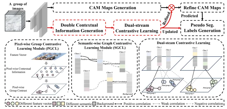 实现了同时利用像素级和语义级跨影像上下文信息的学习。DSCNet的核心创新在于其能够同时处理像素级和语义级上下文信息,为弱监督学习在其他计算机视觉任务中的应用给予了新思路。