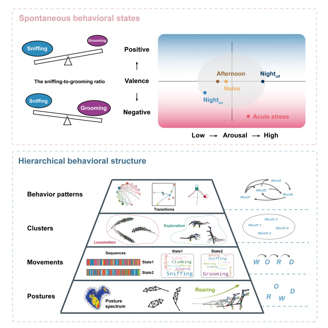 神经行为学(Neuroethology)是一个结合了神经科学与动物行为学的交叉学科,主要研究神经系统如何控制行为,以及行为如何反过来影响神经系统的功能。其核心目标在于理解神经系统如何将生物刺激转化为自然行为,自然行为由一系列动作构成,这些动作根据特定规则以概率方式组合,使得两性个体能够在不同条件下输出恰当的行为,从而维持个体生存、促进物种繁衍。有效分析和量化具有多尺度和复杂动态特征的自然行为,对于理解两性行为差异背后的生物学意义、解析驱动这些行为产生的性别差异性神经机制,进而理解不同物种在进化过程中行为的演变规律,具有重要的科学意义和潜在的应用价值。近年来,行为组学理论的形成和开展旨在以层级化的思路解析行为的内在结构。同时,机器学习算法在定量姿势估计和行为分割方面的进展,也有助于了将陆续在行为分解为可量化的动作模块的进程。然而,缺乏通用的行为学分析框架,仍是将行为组学理论应用于神经行为学、应激神经生物学、系统生物学、药效学评价等领域进行具体行为分析的重要障碍。