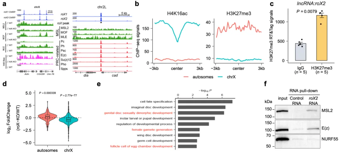 a. roX RNA与MSL复合物及PRC复合物的共定位分析结果;b. roX结合位点邻近区域组蛋白修饰的富集分析情况;c. H3K27me3免疫沉淀样品中roX2 RNA的富集检测结果;d. roX基因敲除后雄性果蝇幼虫转录组的差异表达情况;e. 常染色体上受roX抑制调控的部分基因GO功能富集分析结果;f. RNA pull-down实验验证roX2与相关蛋白的相互作用情况.