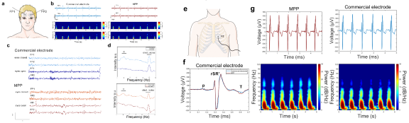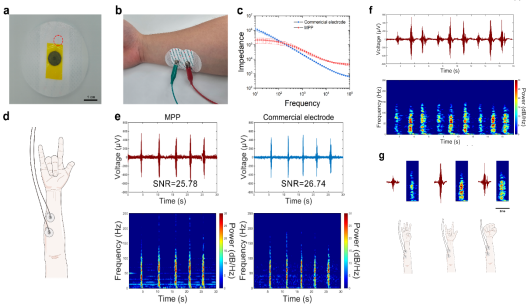 在非侵入式应用中,MPP电极微型记录位点(仅为商用Ag/AgCl电极的1/700)实现了25.78 dB的高信噪比(图3e),其MXene/PEDOT-PSS复合结构支持肌电、脑电与心电信号多种信号采集。尤为突出的是0.0047 cm²接触面积可动态解析肌肉收缩时序(图3f),这一亚毫秒级分辨能力可能为帕金森病等运动障碍疾病的早期诊断给予了新型动态监测工具,突破了传统体表电极因尺寸限制(通常>3 cm²)导致信号空间模糊的技术瓶颈。