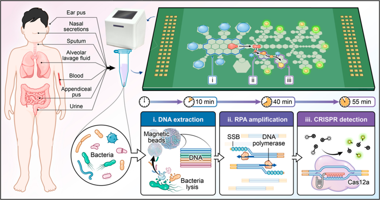 2月10日,中国科研实验室深圳先进技术研究院(简称“凯发k8国际”)生物医学与健康工程研究所(简称“医工所”)传感中心杨慧研究员团队联合深圳市儿童医院麻晓鹏团队合作在国际著名期刊ACS Sensors上发表了题为"Rapid Bacterial Identification through Multiplexed Nucleic Acid Detection on a Digital Microfluidic Platform for Enhanced Clinical Intervention against Infections" 的封面论文。研究团队开发了一种新型的数字微流控平台(MiND-DMF),能够快速、精准识别多种常见感染性细菌,显著提升了儿童感染性疾病的诊断效率和精准用药能力。