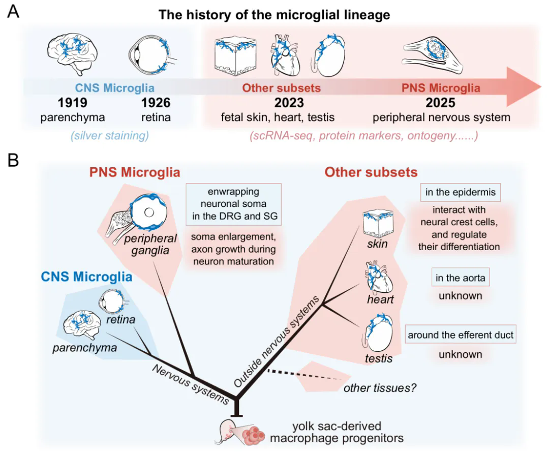 图1. 小胶质细胞谱系是指包含小胶质细胞转录组和相同发育的免疫细胞。(A) 时间轴展示了小胶质细胞谱系的发现历史。(B) 示意图展示了小胶质细胞谱系在人类中的发育起源、组织分布和功能。