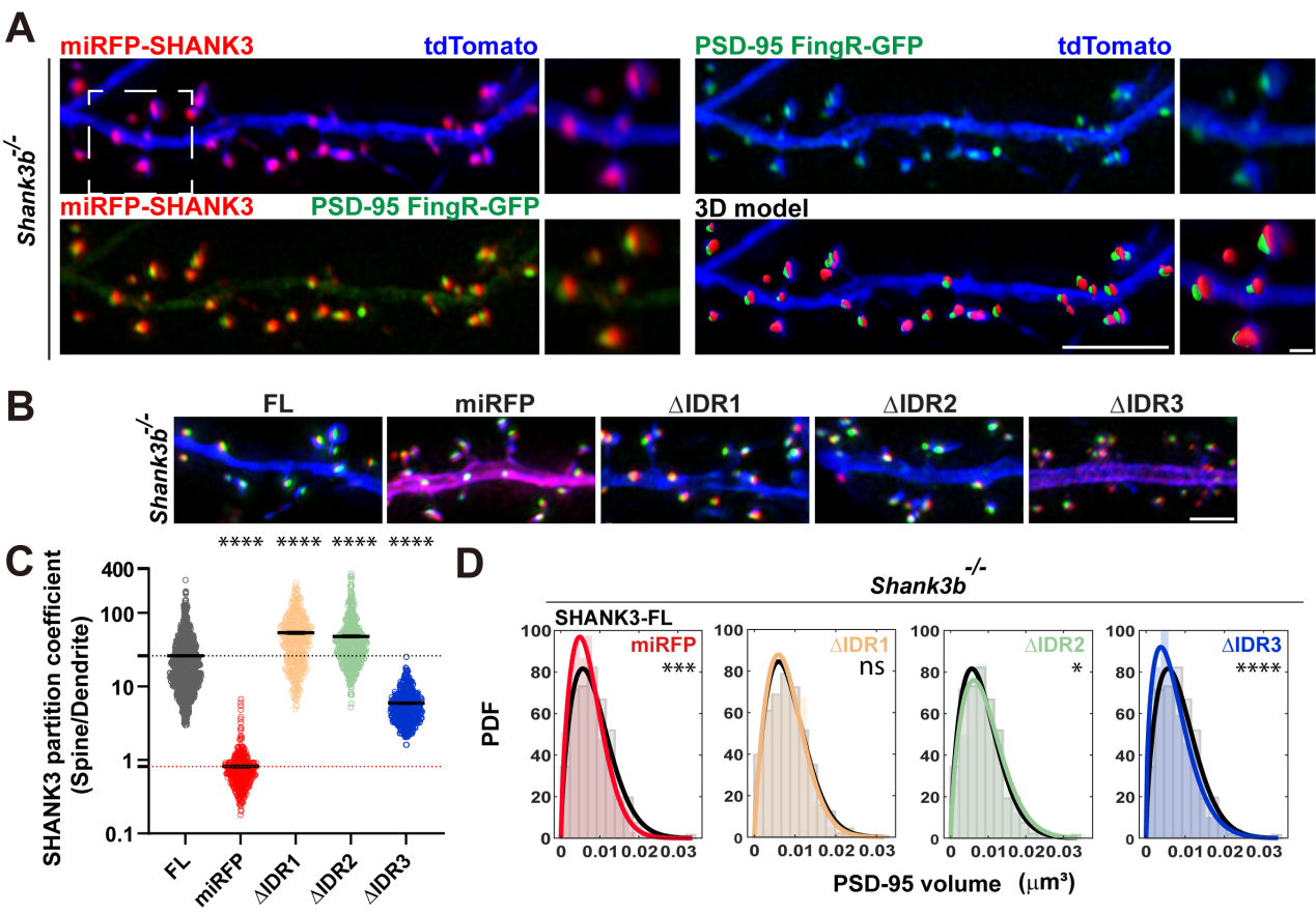 在Shank3b敲除神经元中,全长SHANK3强定位至树突棘并维持静息态中正常PSD体积和AMPAR表达。缺失IDR3或其亚区IDR3-3会削弱SHANK3在树突棘中的富集、让PSD体积缩小并降低GluR1水平。有趣的是,ΔIDR3-1虽能高定位至树突棘,却无法恢复PSD大小,提示存在相分离以外的额外机制。